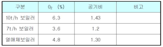 ㅇ 측정한 7t/h 보일러는 적정공기비를 유지하고 있으나 10t/h 보일러와 열매체 보 일러는 배가스중 O2 성분이 적정공기비 1.2보다 높아 과잉공기로 인하여 열손실 이 발생하고 있다.
