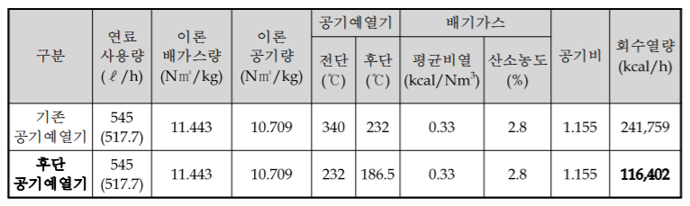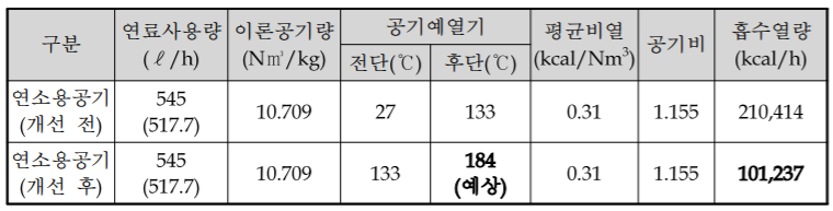 ※ 개선 후 연소용 공기의 흡수열량은 공기예열기 회수열량의 87.0% 적용하였으며, 이를 근거로 공기예열기 후단의 예열공기 온도 계산.